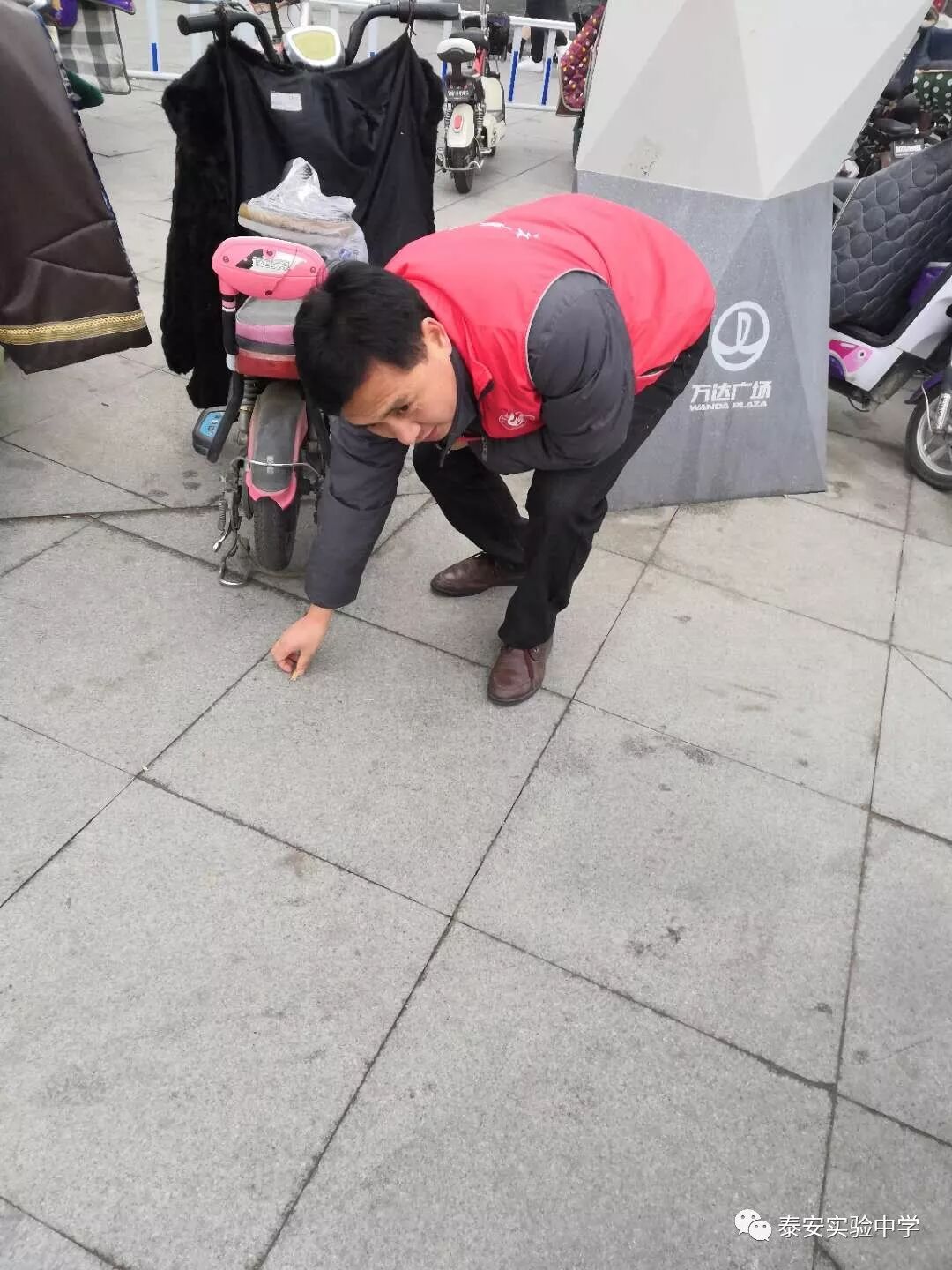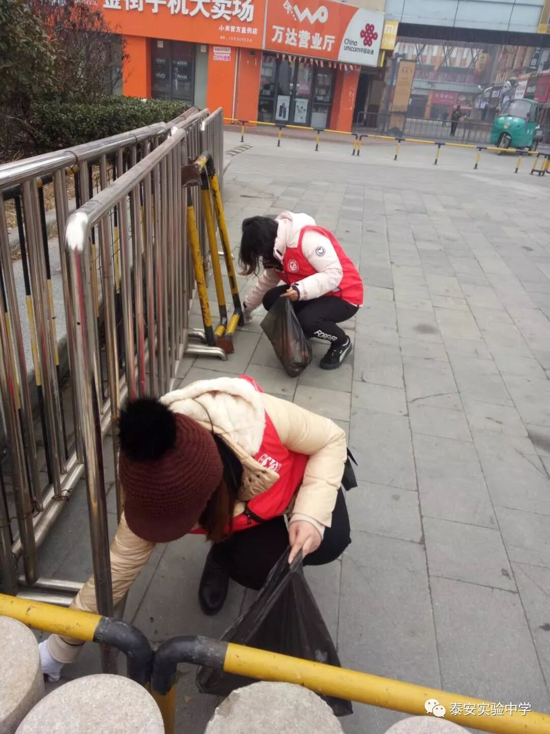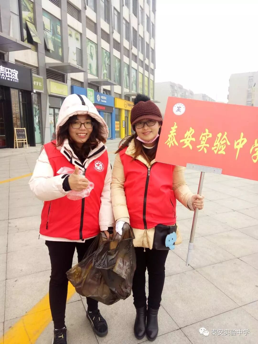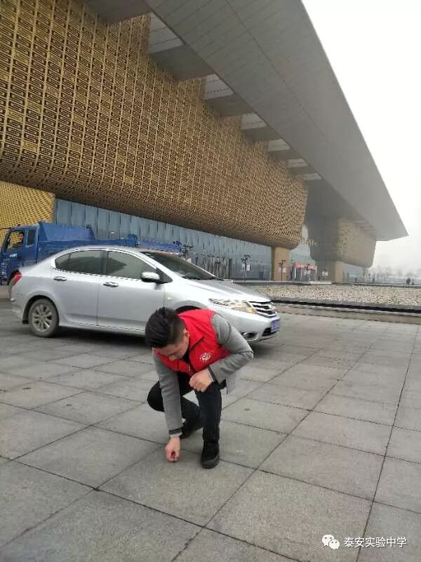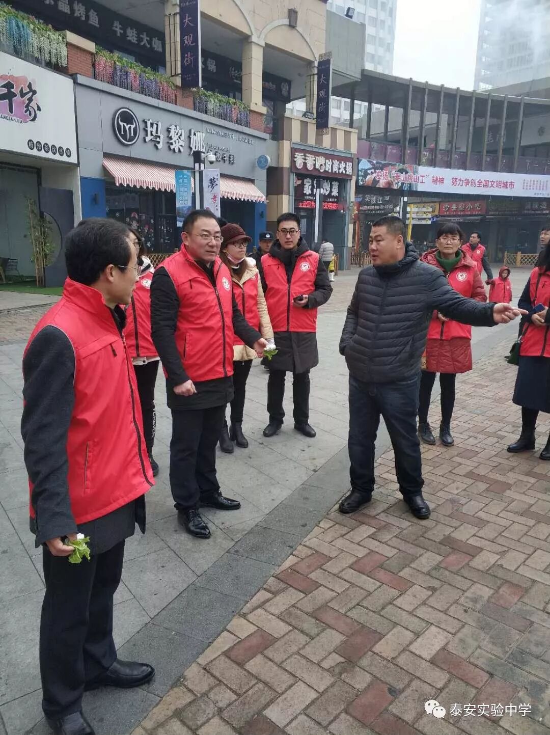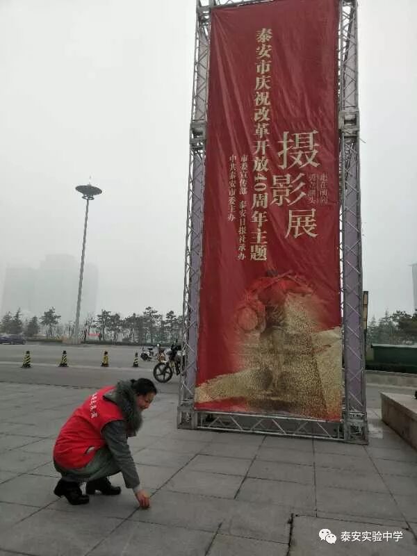 12月16日上午10:30,泰安实验中学部分党员、教师志愿者走进万达广场、会展中心,进行文明劝导,并沿路捡拾烟头、垃圾。