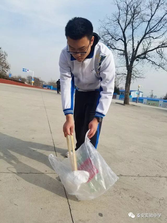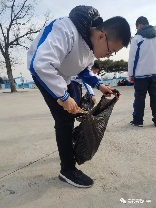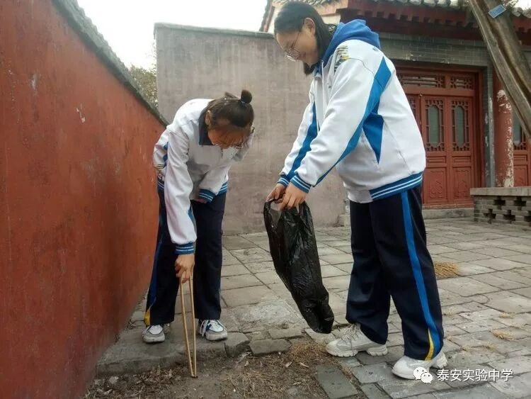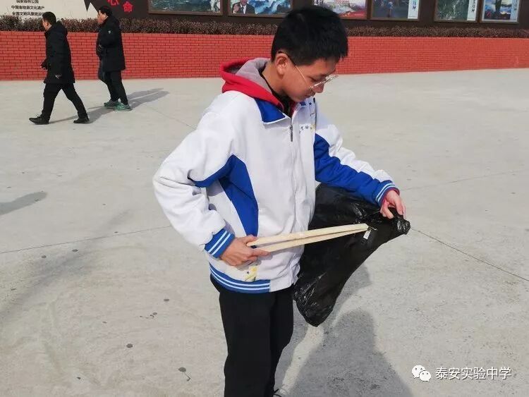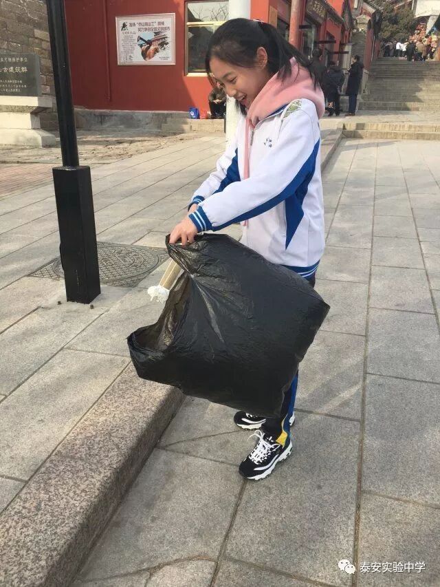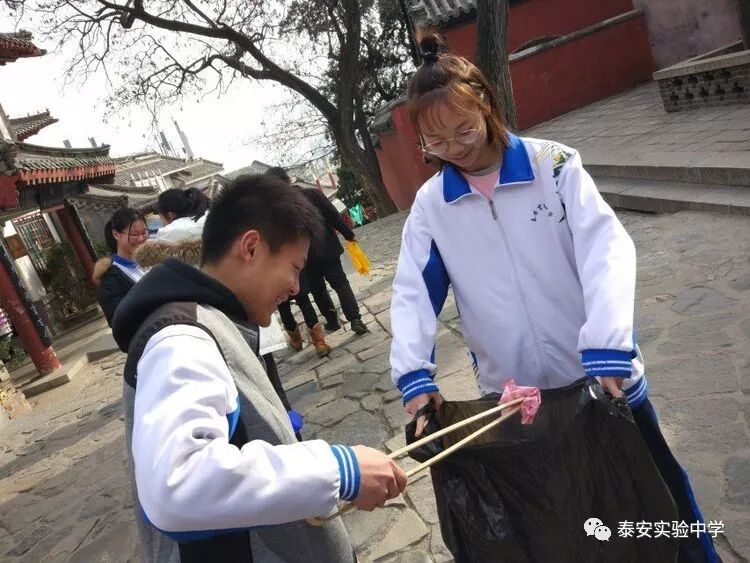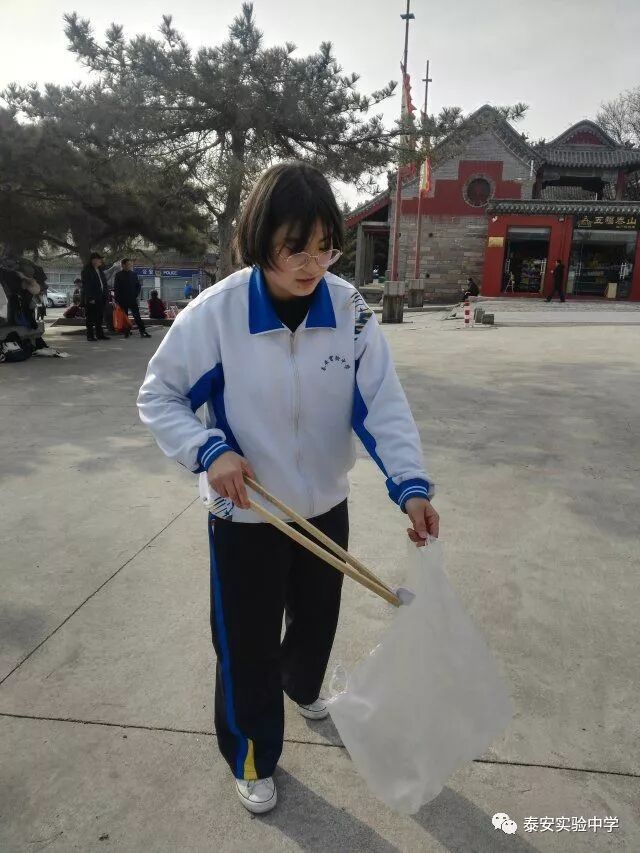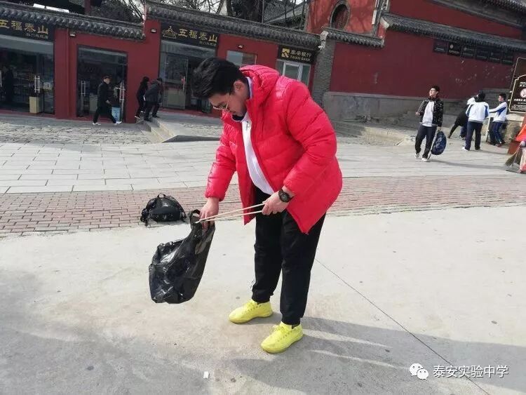 同学们拿来专门的夹子与垃圾袋,清理红门景区(一天门附近)卫生,为泰安的绿水青山添一抹鲜亮的色彩。