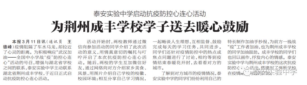 为积极响应“ 武汉 加油!——全国中小学战‘疫’防控心连心”活动的号召,增强与湖北省学校之间的联系,同时为学生创造共同战“疫”平台,泰安实验中学主动联系湖北省荆州成丰学校学生于2月23日正式启动“战‘疫’防控心连心”活动,让爱跨越地理的阻隔、冲破疫情的阴霾,从学习、生活、心理建设上帮助双方学生共同成长。 3月12日,《泰安日报》教育版刊发了我校这项活动新闻。