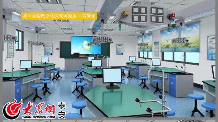 泰安实验中学总建筑面积9.9万平方米,校园西侧是三幢连体教学楼,每个年级相对独立,能容纳60个班规模。连廊内配有国学室、书法室、陶艺室等,内设有四个音乐教室,四个美术教室,四个通用技术实验室,国内先进的理化生吊装实验室各六口,数字探究实验室和学科教室各一口。宽敞明亮的教室内配有绿色环保多功能课桌椅和学生书柜,现代化智慧黑板和电子班牌,班班实现物联互通。