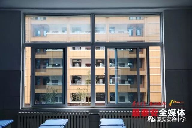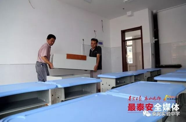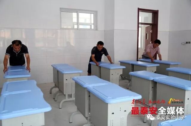 在一间教室内记者看到,海蓝色的课桌椅摆放整齐 , 虚位以待。" 颜色给人一种很安静的感觉,选材方面也更注重环保。" 泰安实验中学筹建办公室工作人员介绍,课桌面板采用 ABS 耐冲击塑料一体射出成型,桌钢架是采用椭圆钢管,更加安全环保。此外,教室还将配备学生书柜,现代化智慧黑板和电子班牌,班班实现物联互通。